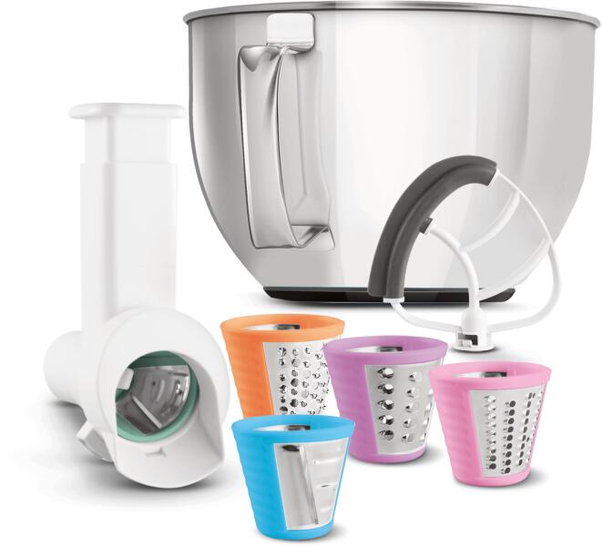 Konyhai Robotgép tartozék készlet STM 635X- Tartalma : Daráló és szeletelő feltétek, szilikonos keverőszár, 4,5 Literes rozsdamentes acél keverőtál